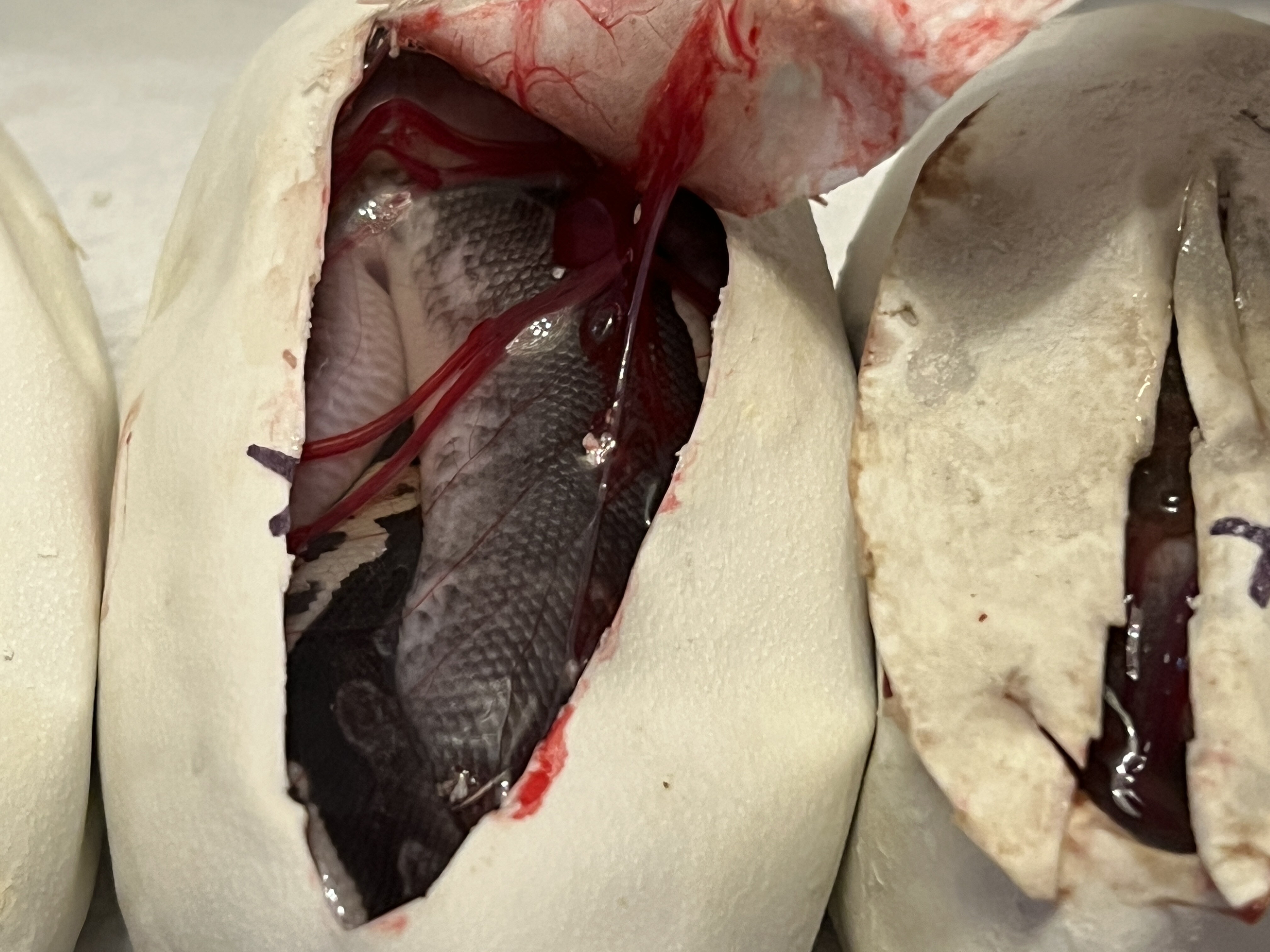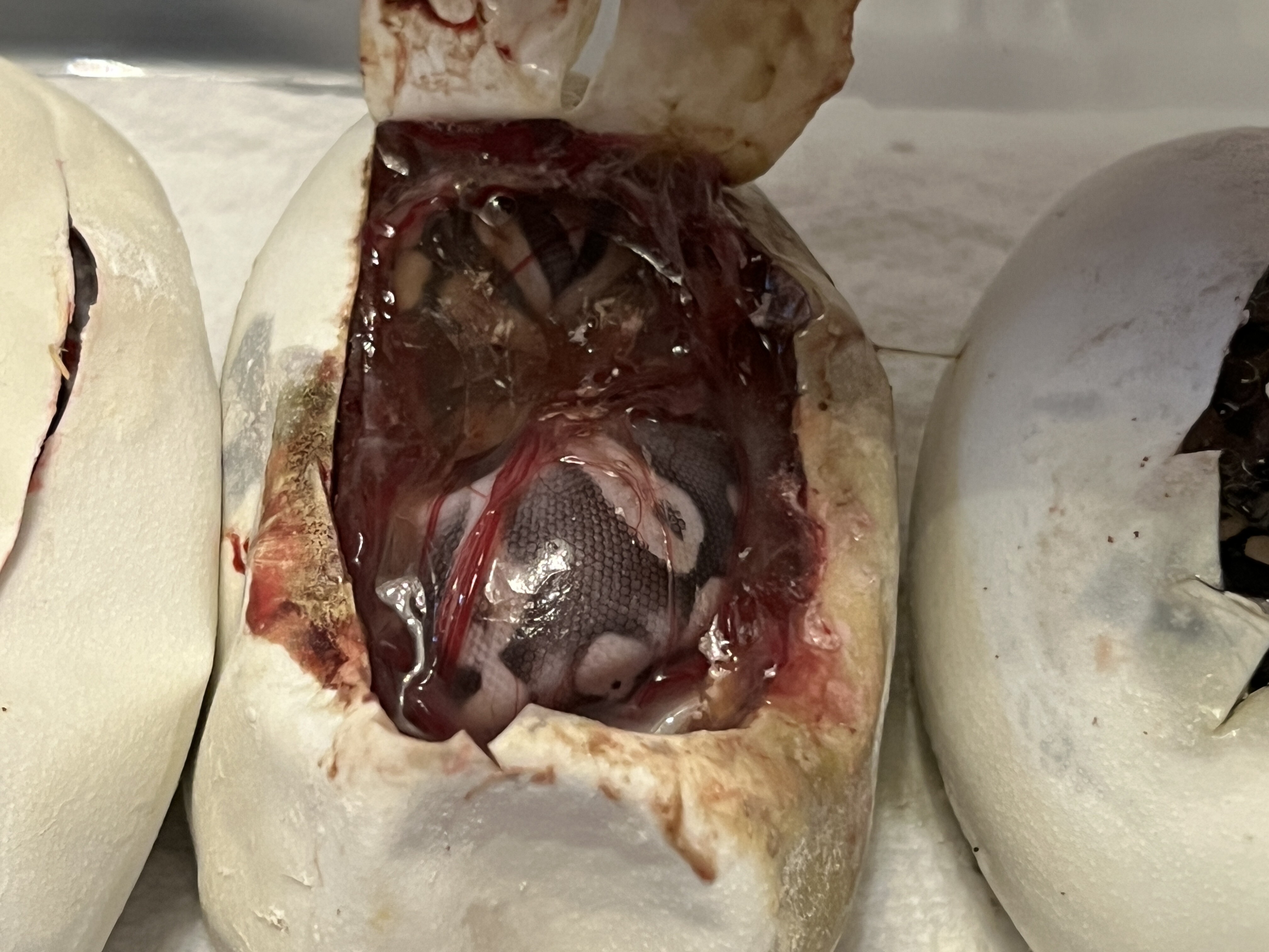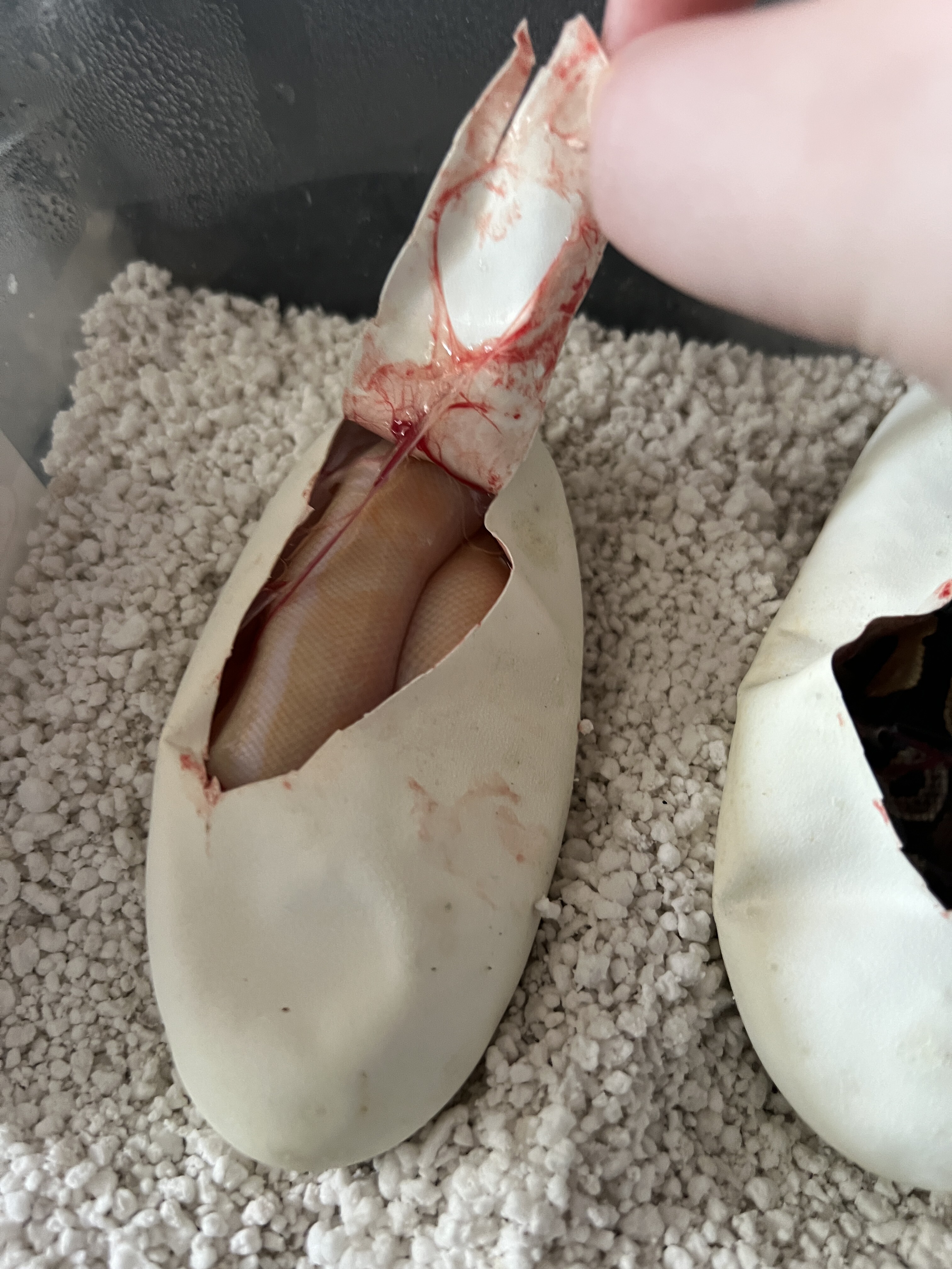 Full transparency, I had cut one of the eggs maybe 12 ish hours earlier than the one that pipped because I was worried about the color of the egg and wanted to make sure the baby inside was still okay, and it was/is! Hence why the blood looks a little dried/old.