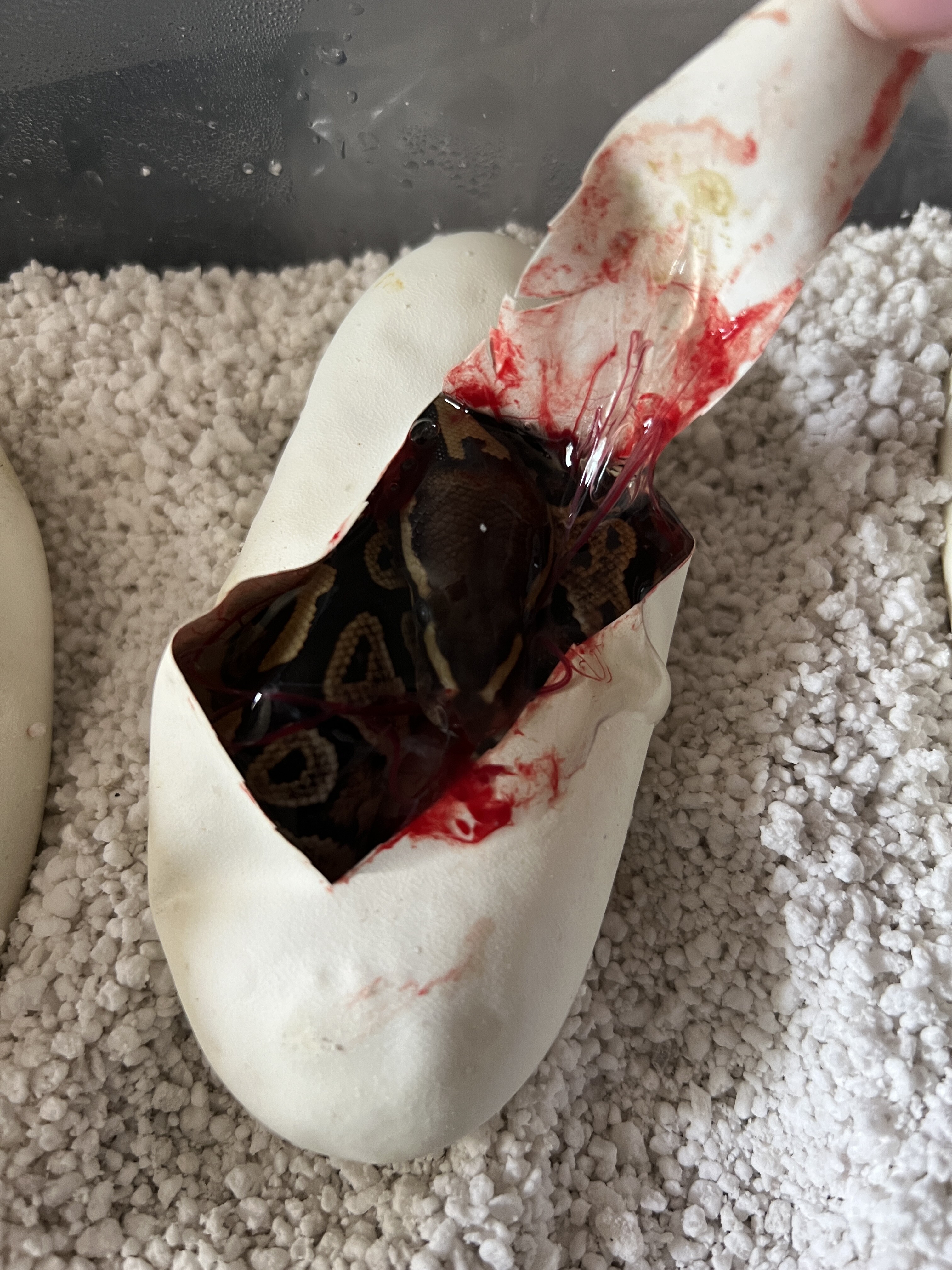 The remaining babies have all finally come out of their eggs — unfortunately the one I cut a day early also turned out to be underdeveloped and passed away shortly after leaving the egg. One of my kingsnakes happily accepted the meal.