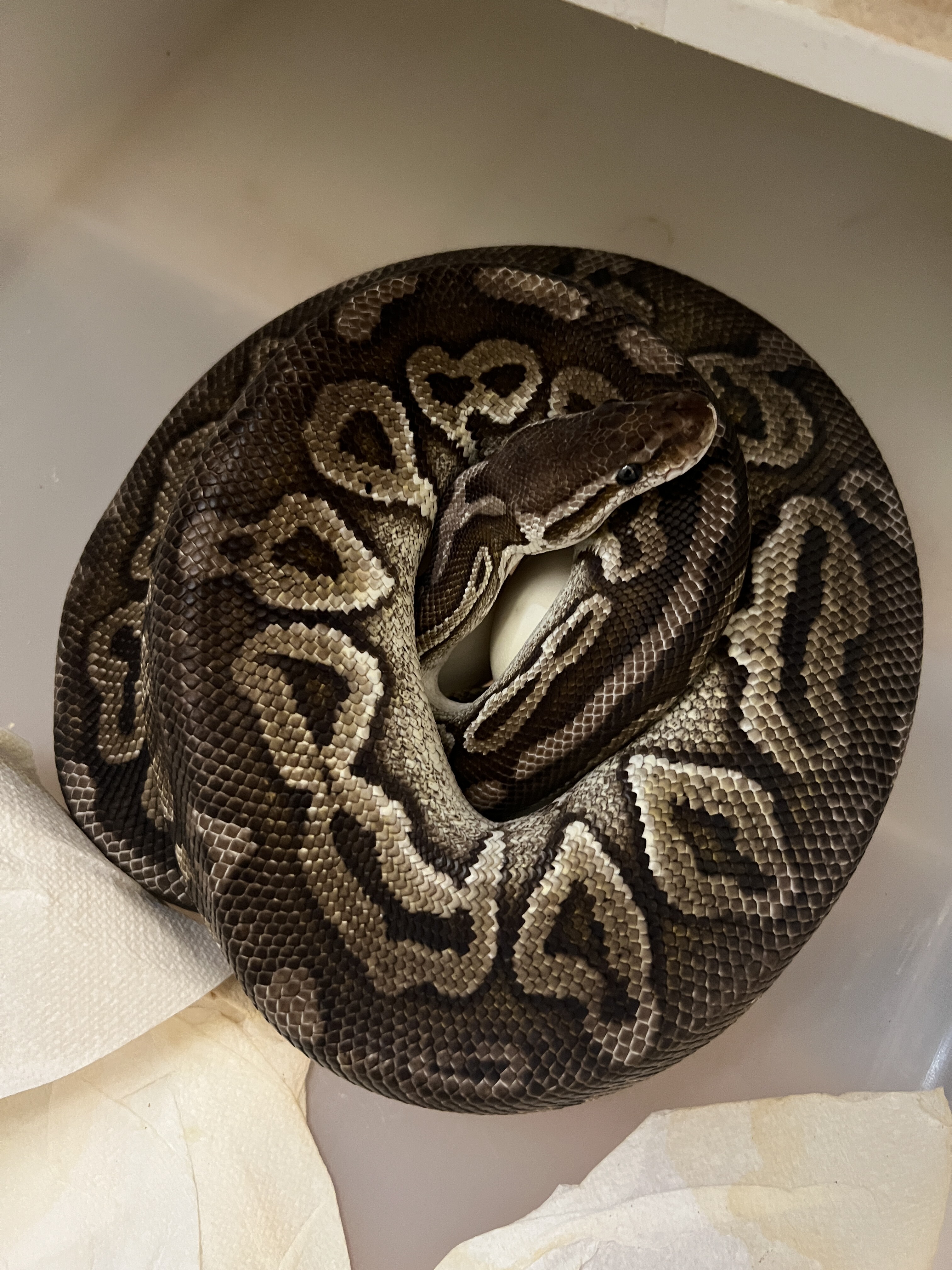 I have heard occasionally they will take food after ovulation, some keepers used to offer smaller then usual food items to the female thinking they would have more substance to go through the laying process. Of course this isn’t necessary and most females usually won’t take. I have offered before to some females just to see and none have ever shown any interest for me. I think she probably knows what’s best for her either way, food or no food. I bet she won’t take again though, she should be running out of room in her belly!