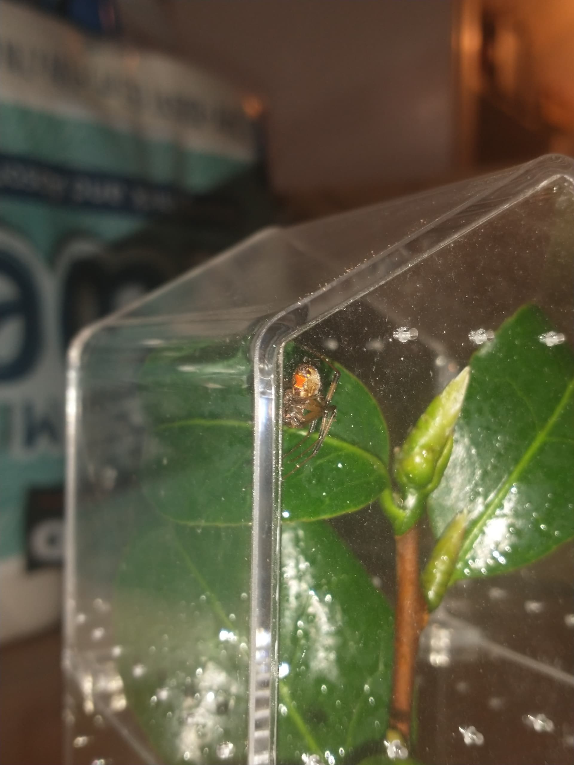 This is Salome! I believe she’s a juvenile brown widow, and she’s totally gorgeous. I found her in the door of a van at work. I’ll work on getting some better pictures, but for now, here’s a couple showing off her pretty booty pattern and her Latrodectus hourglass.
