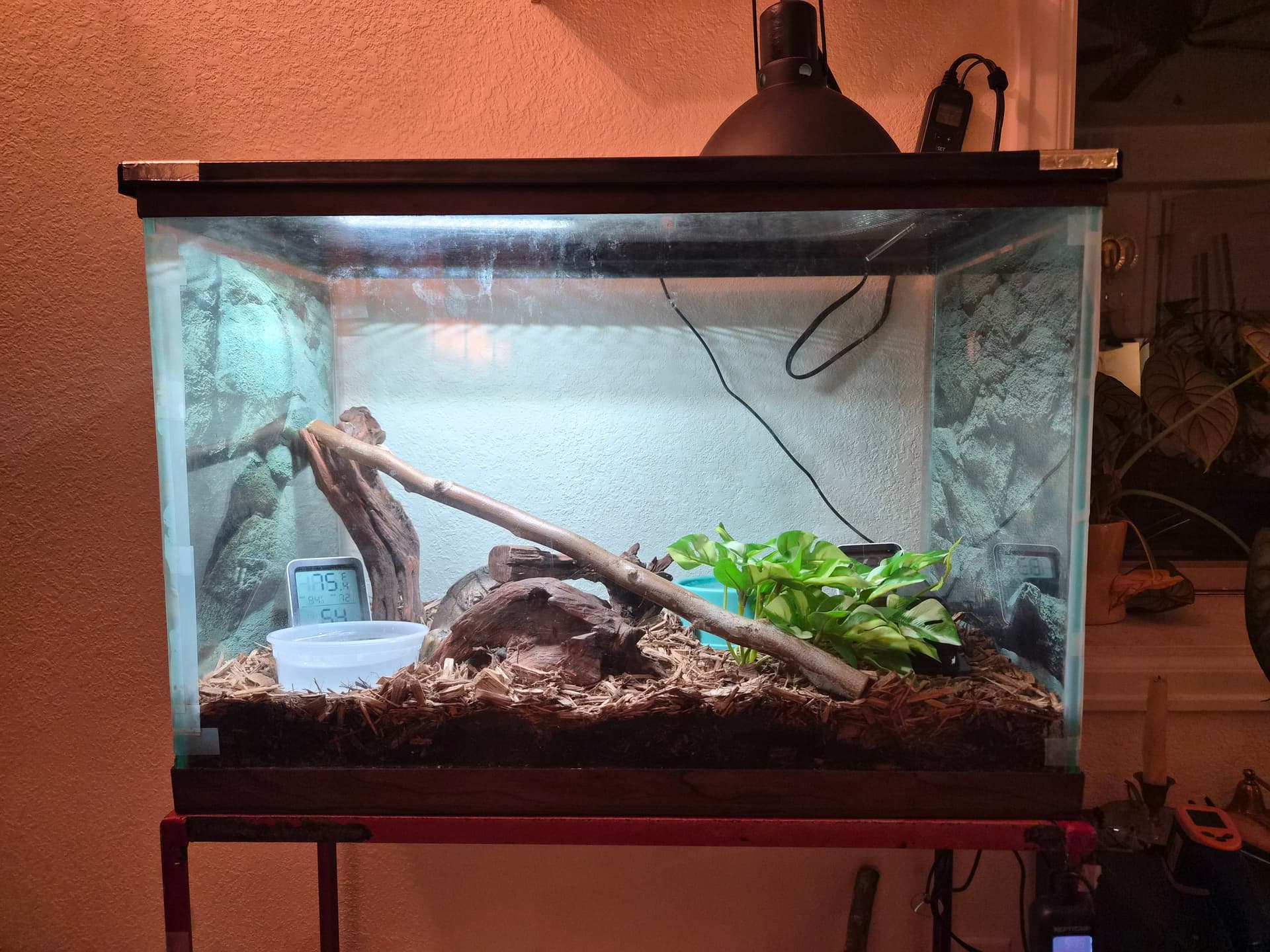 Substrate is about 3.5" of reptisoil + forest floor, 30/70 respectively. UVB is on 12 hours a day, measured for zone 2. Heat comes from a 100w DHP (thermostat probe visible in top right).